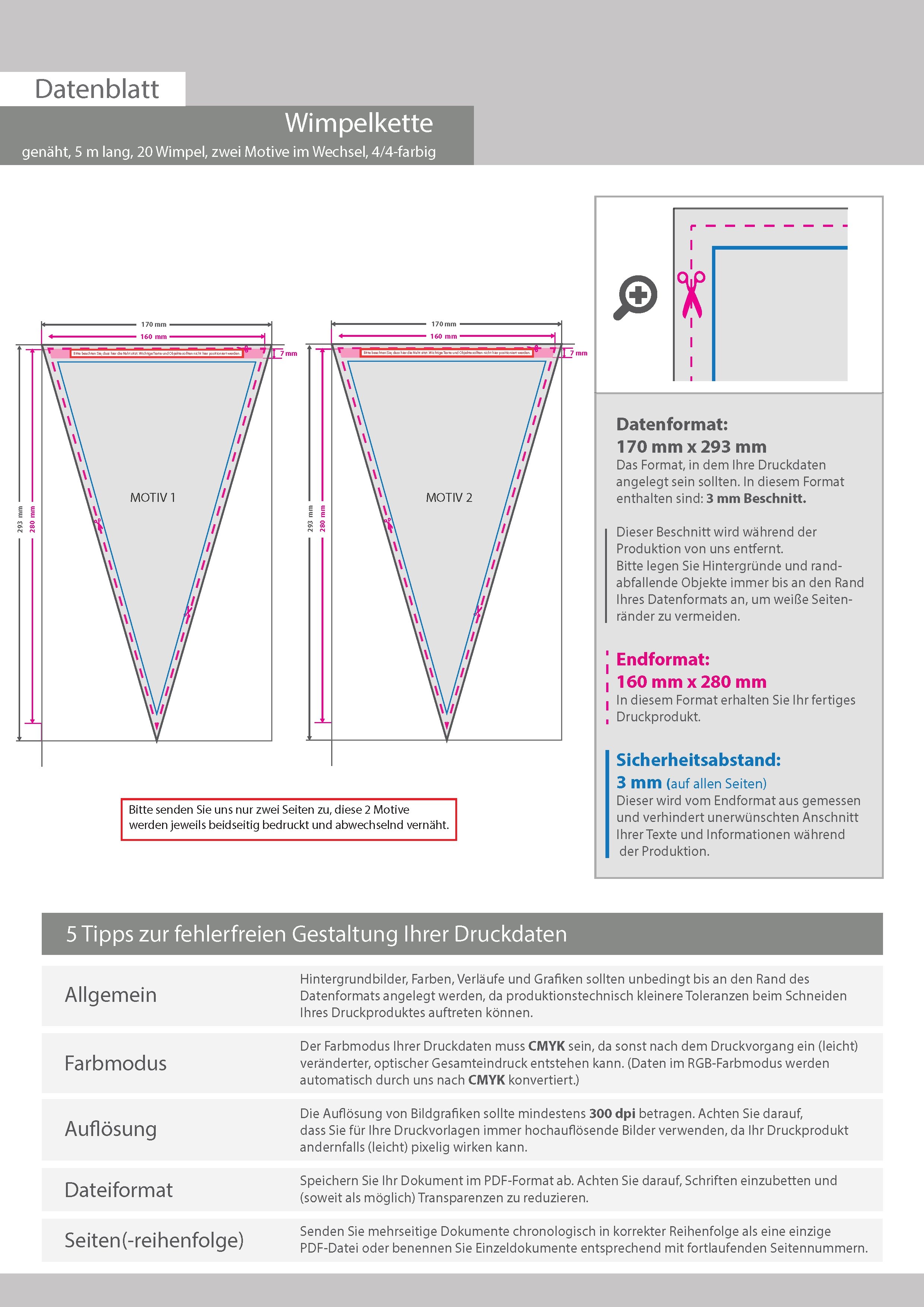 Wimpelkette genäht, 5m lang, 20 Wimpel, zwei Motive im Wechsel, 4/4-farbig beidseitig bedruckt
